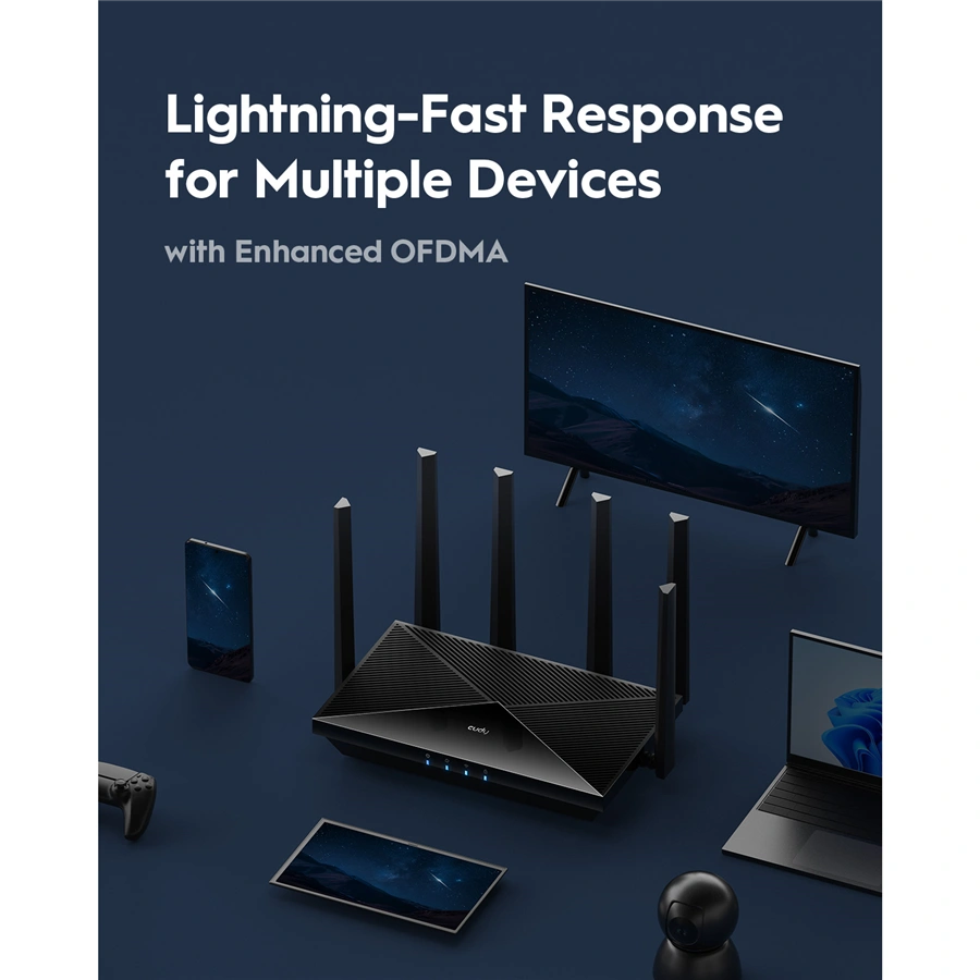 - ďalšie technológie: MLO, MRU, OFDMA, MU-MIMO, Beamforming, Cudy Mesh