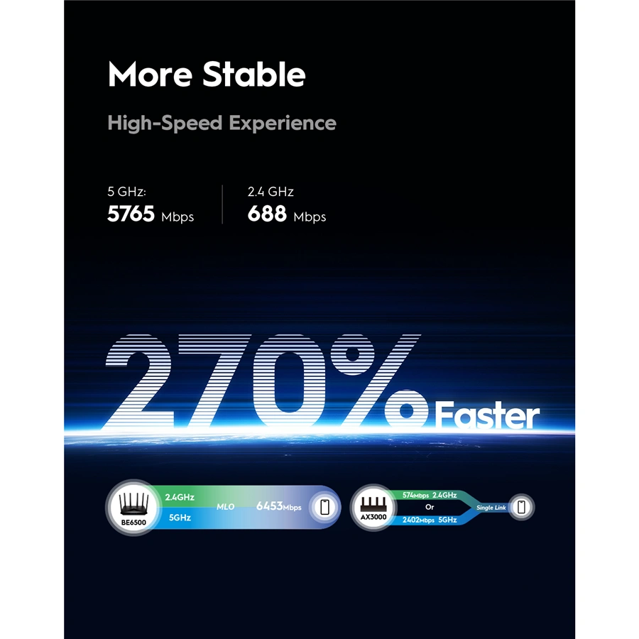 - Multi-Link prevádzkový režim (MLO) pre pripojenie zariadení v oboch pásmach súčasne (2,4 GHz + 5 GHz) a maximálne využitie prenosového pásma