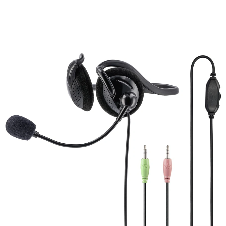 - kancelársky stereo headset na uši (On-Ear) s hlavovým oblúkom za krk, s nastaviteľným ramenom mikrofónu a 2x jack 3,5 mm jack pripojením