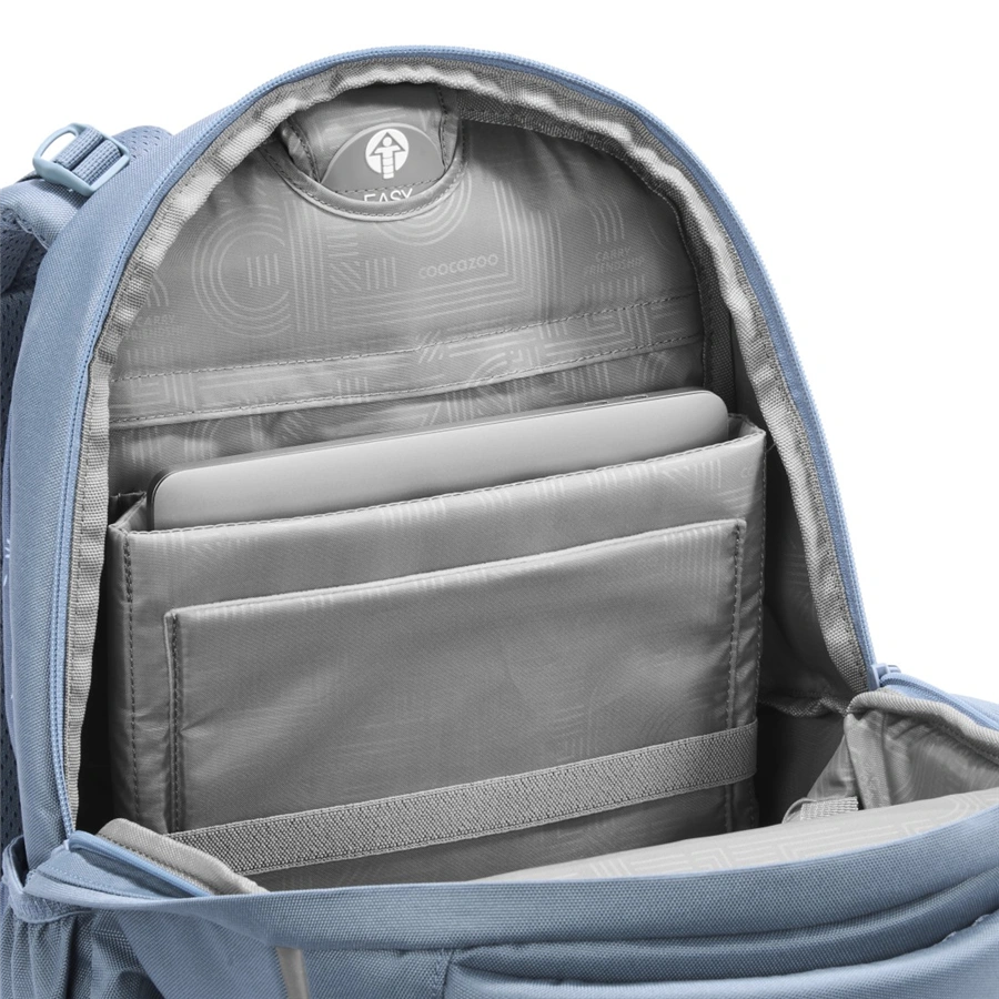 - veľký hlavný priečinok s polstrovanými priehradkami pre tablet a notebook, priehradky tlmia nárazy vďaka zavesenému prevedeniu (nedotýkajú sa dna ruksaku)