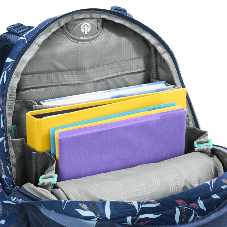 - veľký hlavný priečinok s priehradkou na knihy a odnímateľnou priehradkou, vrecko s organizérom a predné vrecko napr. na desiatovú krabičku