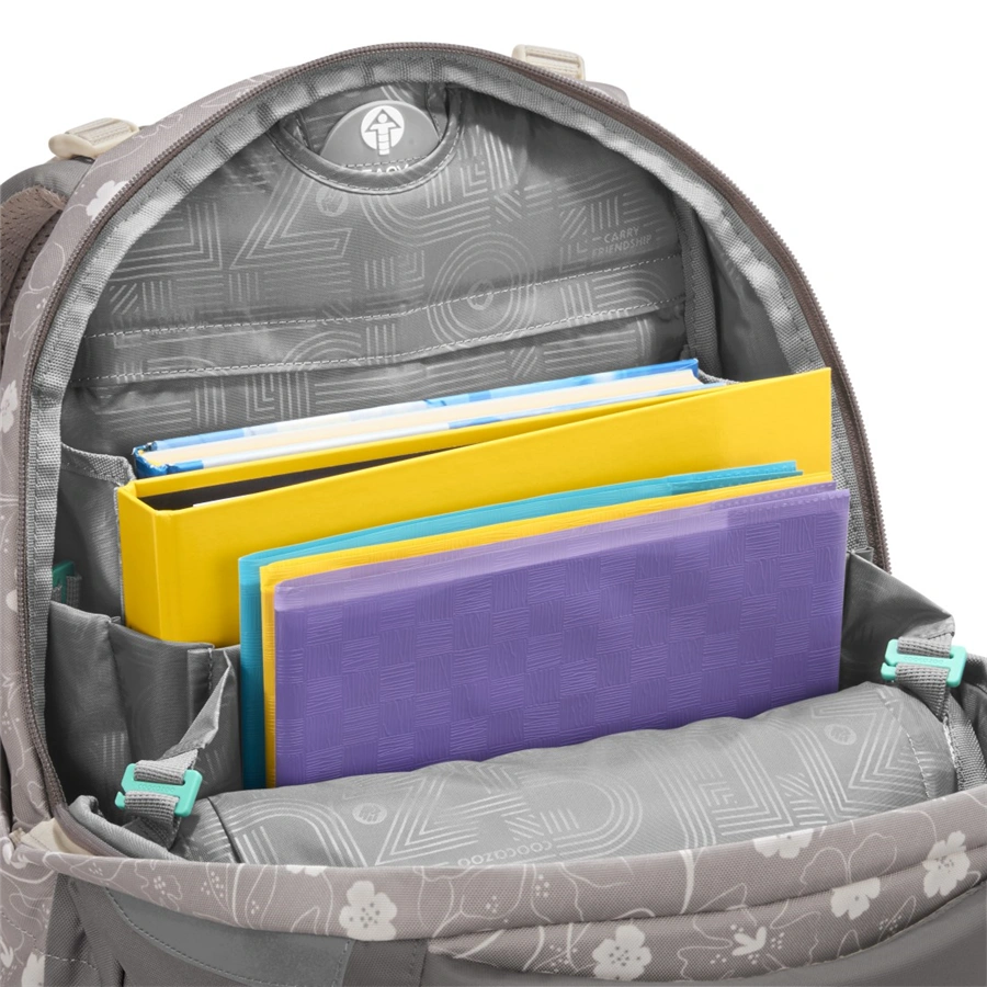 - veľký hlavný priečinok s priehradkou na knihy a odnímateľnou priehradkou, vrecko s organizérom a predné vrecko napr. na desiatovú krabičku