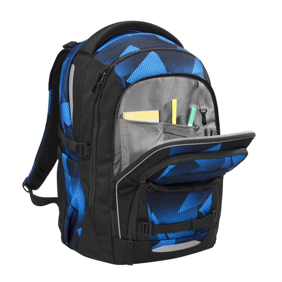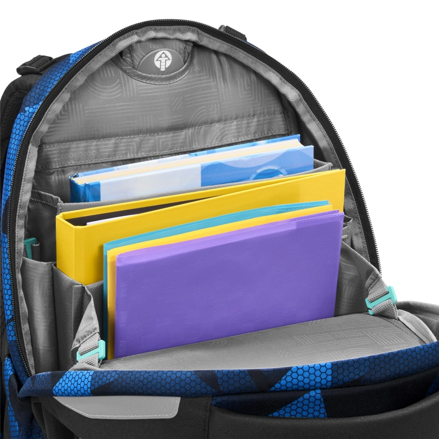 - hlavný priečinok s priehradkou na knihy a odnímateľnou priehradkou, veľké vrecká, vrecko s organizérom a dve malé predné vrecká napr. pre desiatovú krabičku a drobné osobné veci