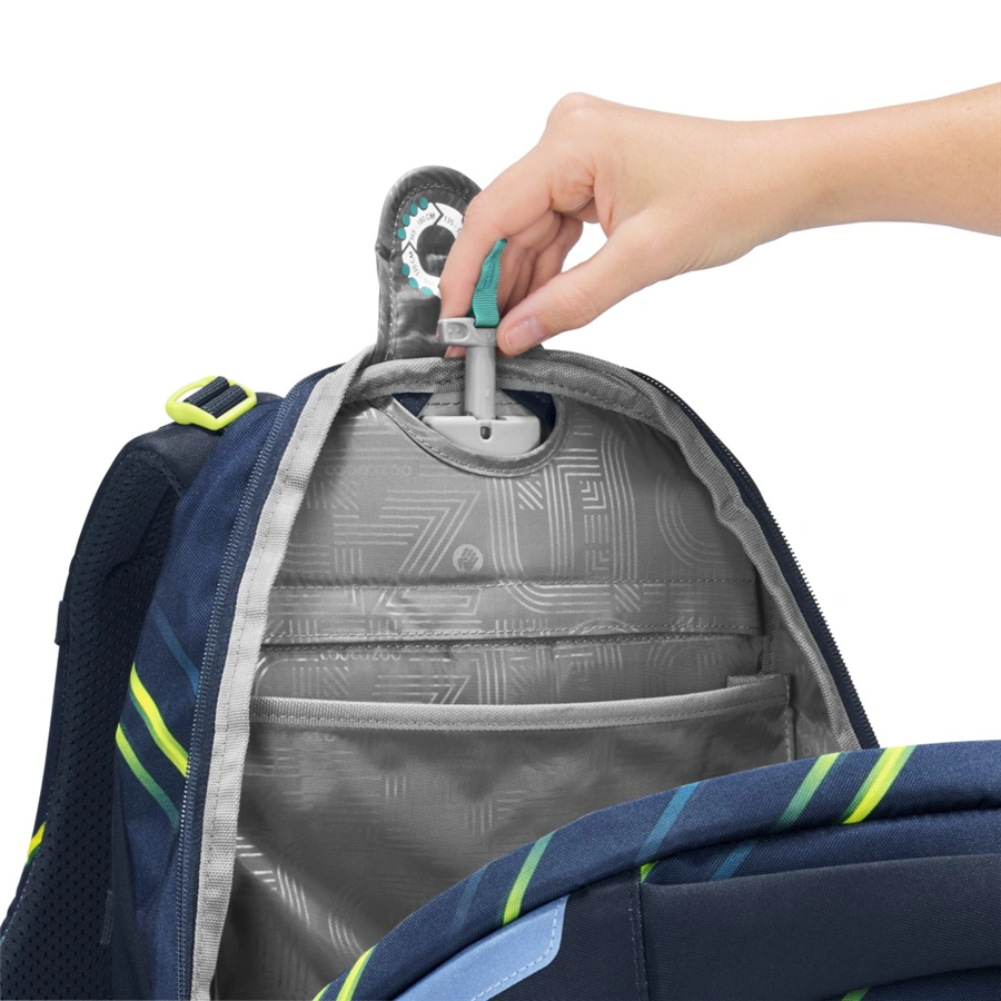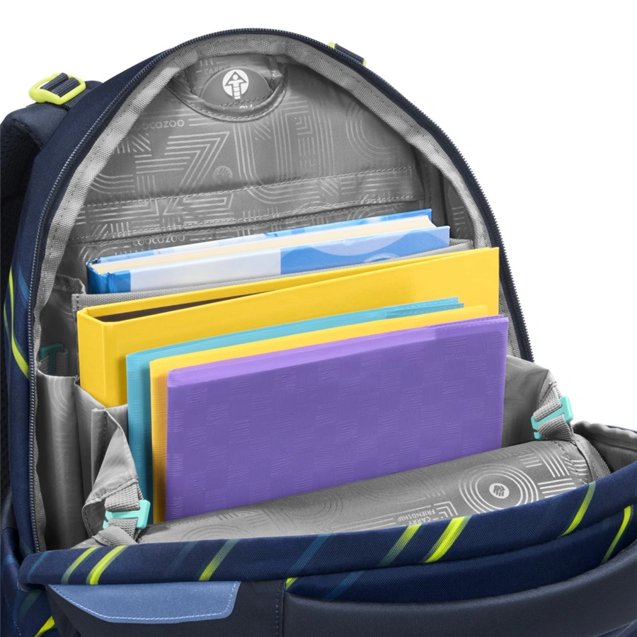 - hlavný priečinok s priehradkou na knihy a odnímateľnou priehradkou, veľké vrecká, vrecko s organizérom a dve malé predné vrecká napr. pre desiatovú krabičku a drobné osobné veci
